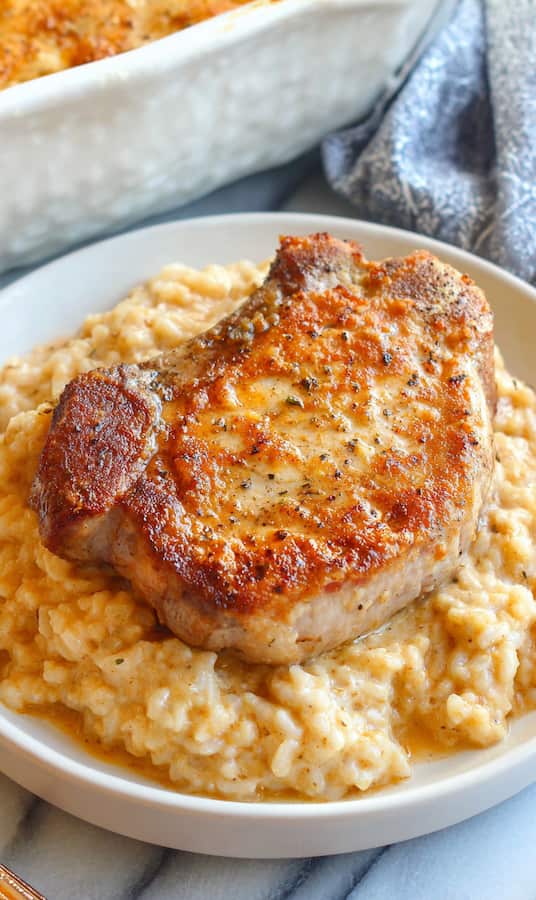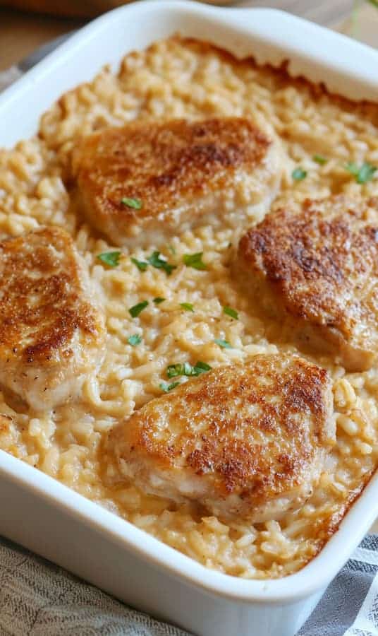 Uncover and bake 25-30 minutes more âtil the rice is tender and pork chops are golden (internal temp 145°F). Let rest 10 minutes, then scoop and serveâwarm and comforting!